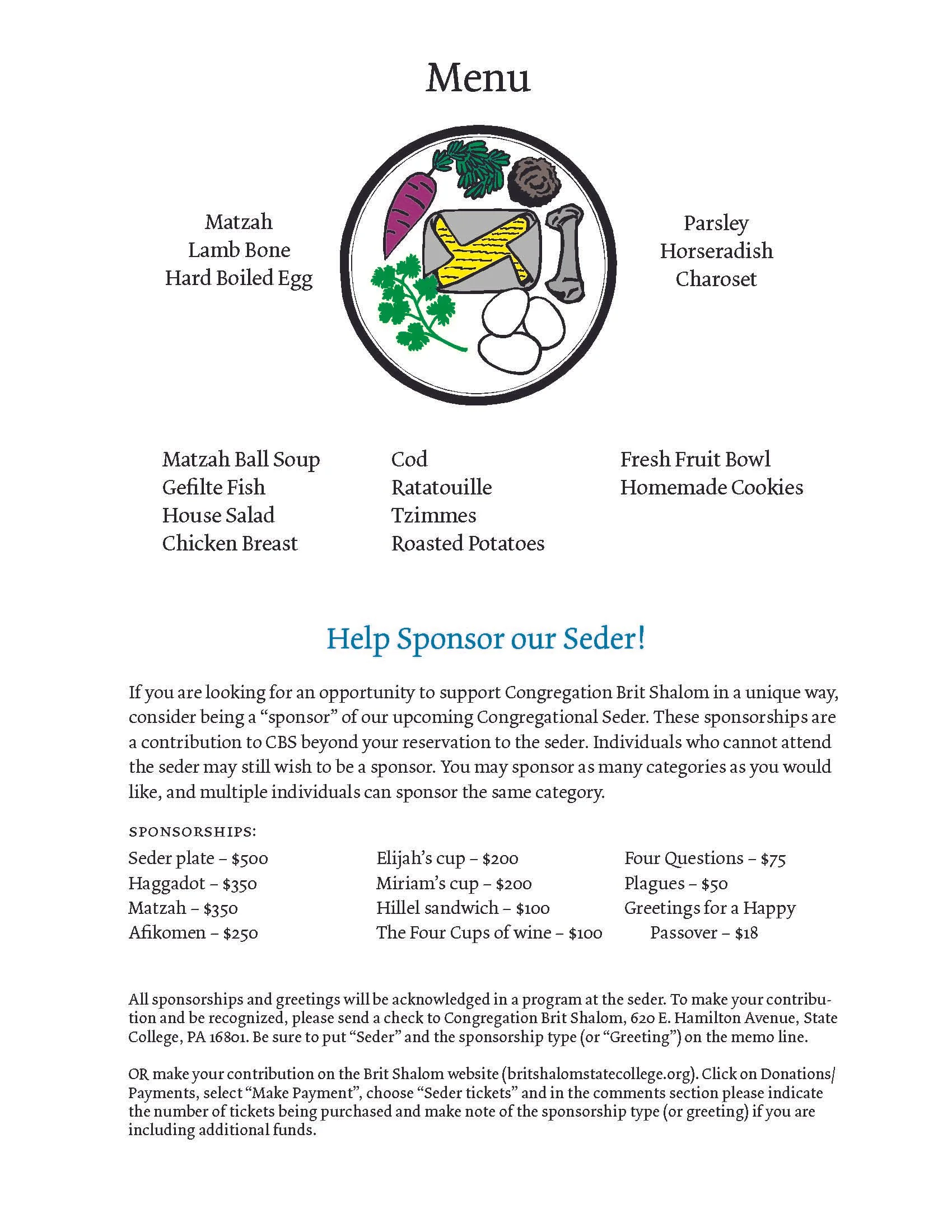 Join us for the Brit Shalom community seder on Wednesday April 1st at 5:30 pm at the Centre Hills County Club. Note that there are two methods of payment: either online by CLICKING HERE; or by mailing a check to Michelle Davis in the Brit Shalom office at 620 East Hamilton Ave, State College, PA 16801.