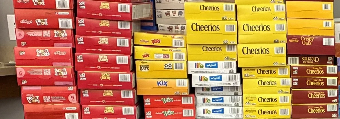 As in years past. the Brit Shalom religious school students organized a Rosh Hashanah food drive to support the State Collge food bank. Among the other items they collected were a host of different cereal boxes.